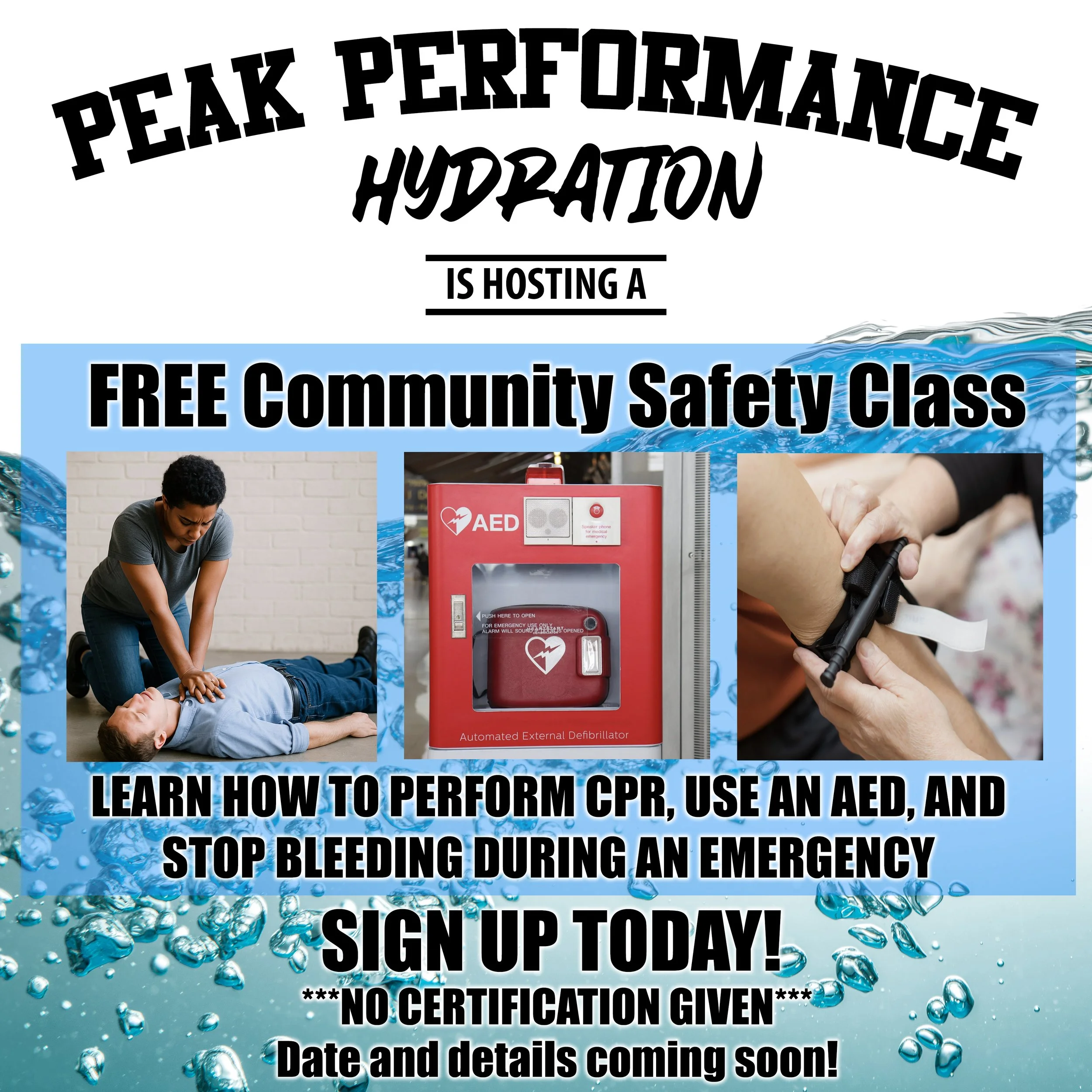 This holiday season, Peak Performance Hydration is giving back to our community by hosting a FREE CPR, Stop the Bleed, and AED class! This is a non-certification, hands-on class designed to teach you how to act confidently in an emergency. Whether at home, at work, or out in the community—knowing what to do can save a life.